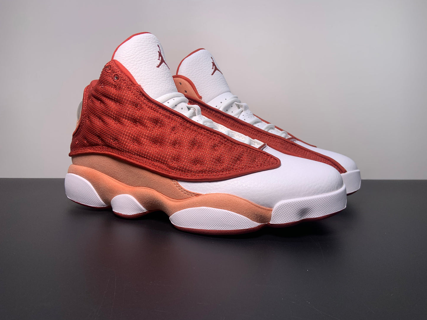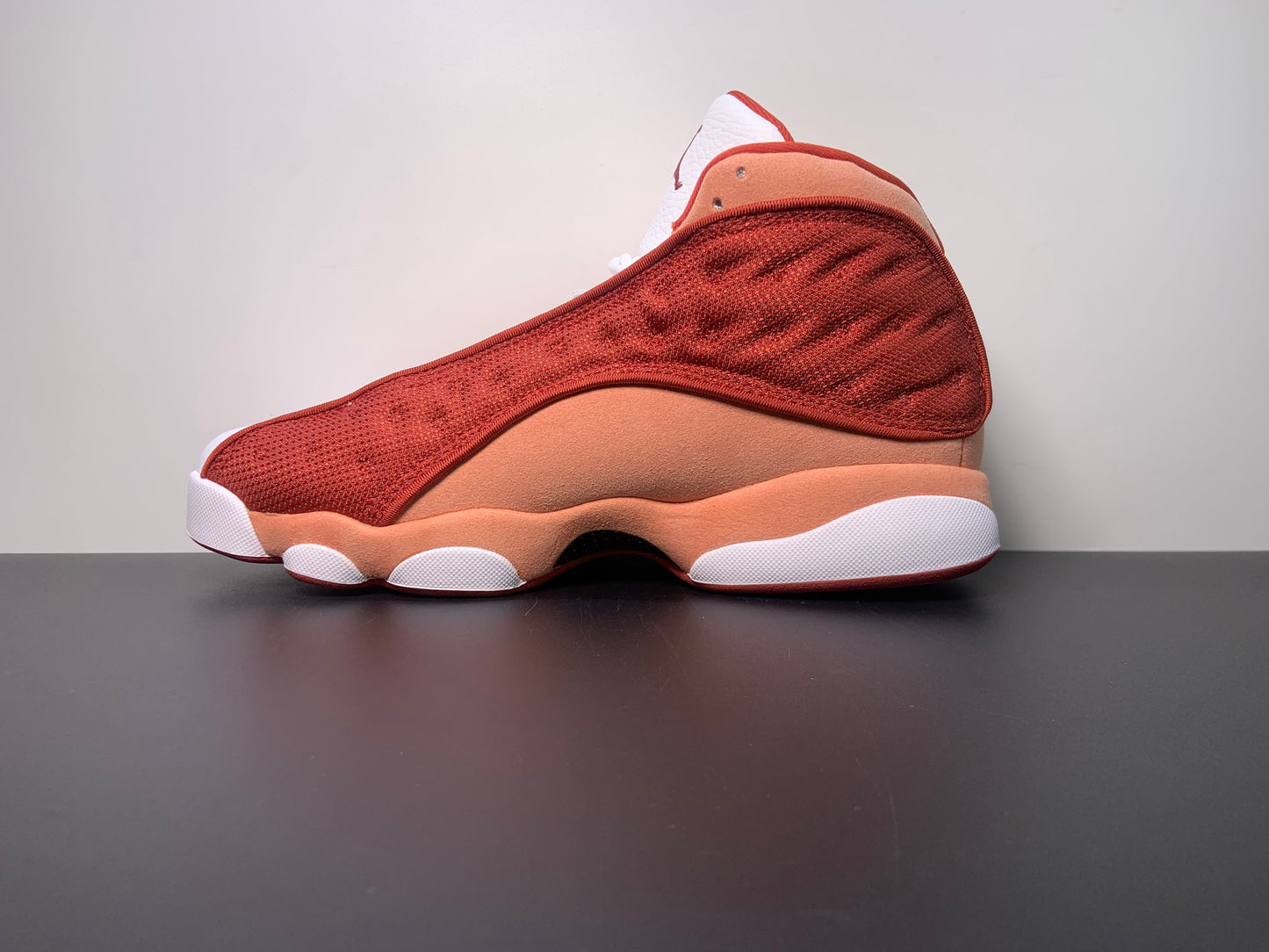 The Air Jordan 13 Retro 'Dune Red' sports a white leather upper with dimpled mesh overlays in a dark crimson hue.