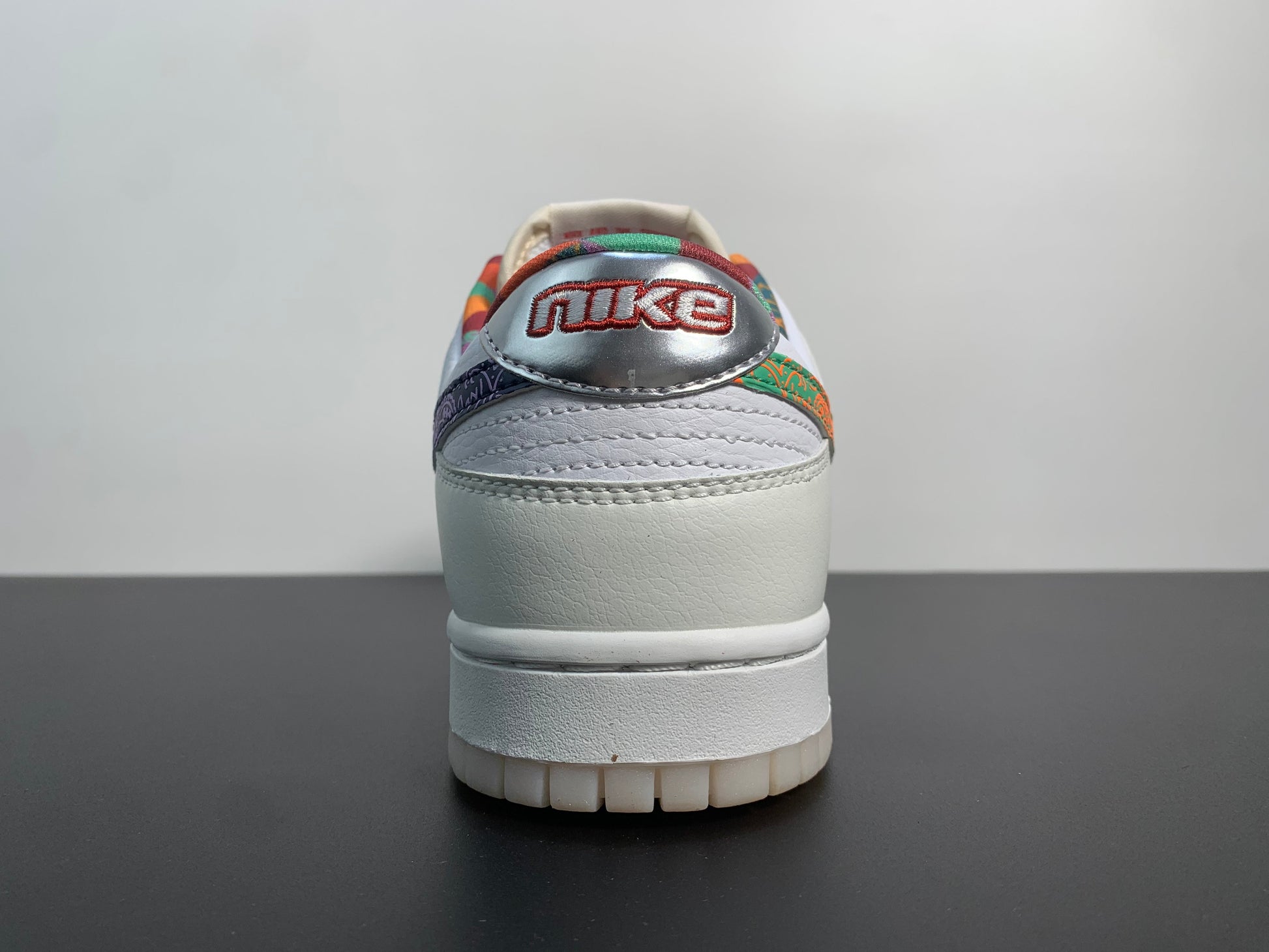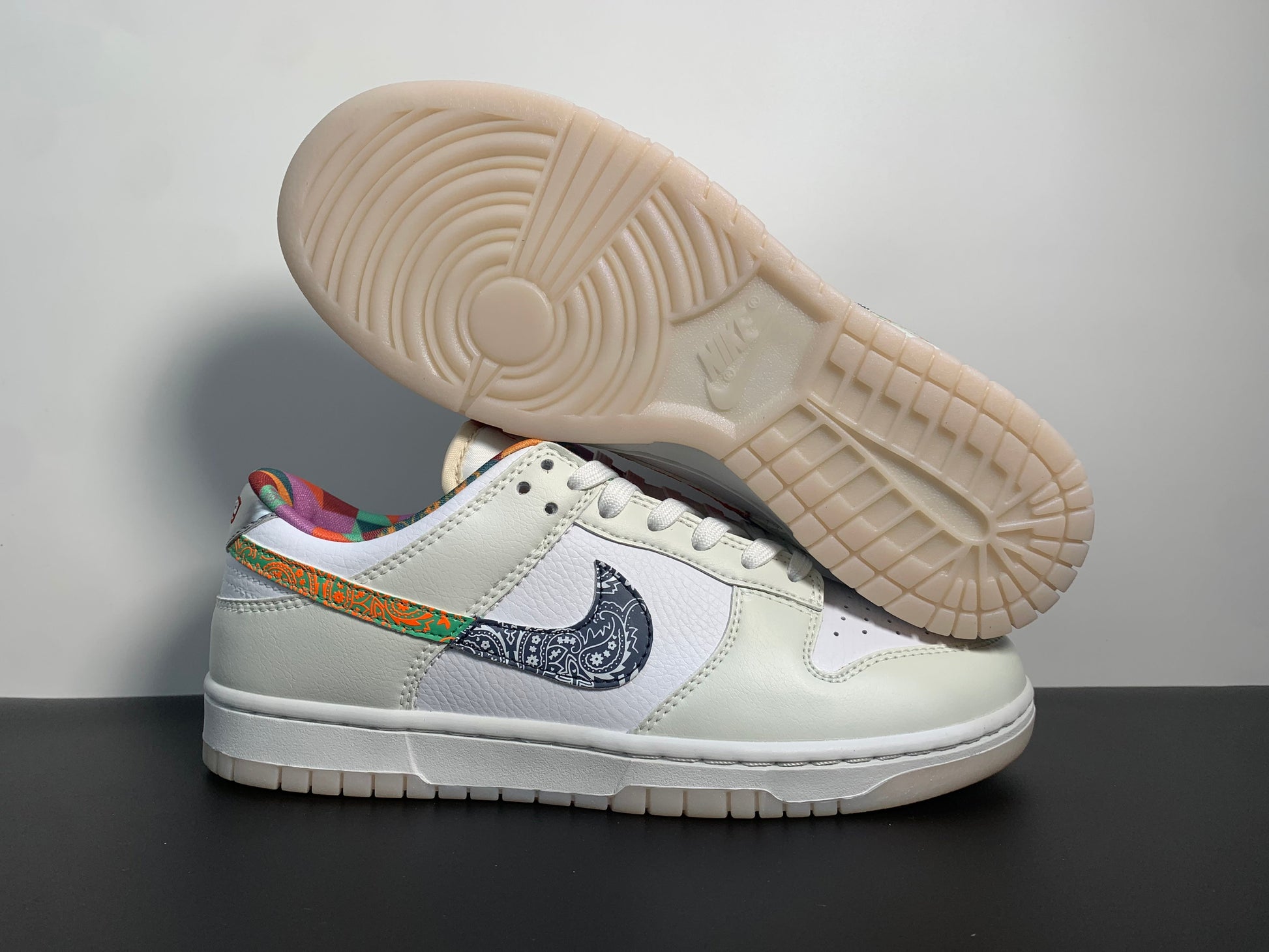 Made for big kids, the Nike Dunk Low GS ‘Multi-Color Paisley’ off-white leather upper features mismatched paisley print Swooshes and a Nike-branded back tab in metallic silver. Padded textile lines the low-cut collar in a hectic, multicolor design. The low-top rests on a stark white rubber midsole, fitted with an interior foam wedge and supported by a semi-translucent outsole.