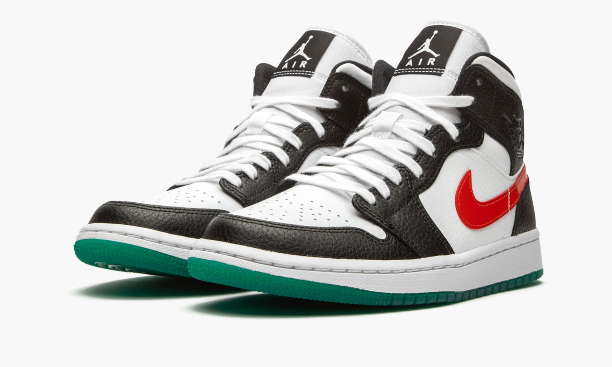 The Women’s Air Jordan 1 Mid “Alternate Swooshes” shuffles the design of Michael Jordan’s first signature shoe in mid-top height with alternating Swoosh logo colors. Fitted in women’s sizing, this Jordan 1 Mid features a unique appearance that caters to the lifestyle look. Key design elements include white leather detailing on the perforated toe, mid-panel, and collar. Contrasting black tumbled leather overlays on the forefoot, eyelets, collar, and heel stand out against the crisp white base. A University Red leather Swoosh can be found on the outside of the shoe and a yellow leather Swoosh dots the inside portion. Additional branding appears in the form of tonal “Wings” logos on the collar and white Jumpman motif on the black nylon tongue tab. A crisp white nylon tongue and white cotton laces finish off the look.