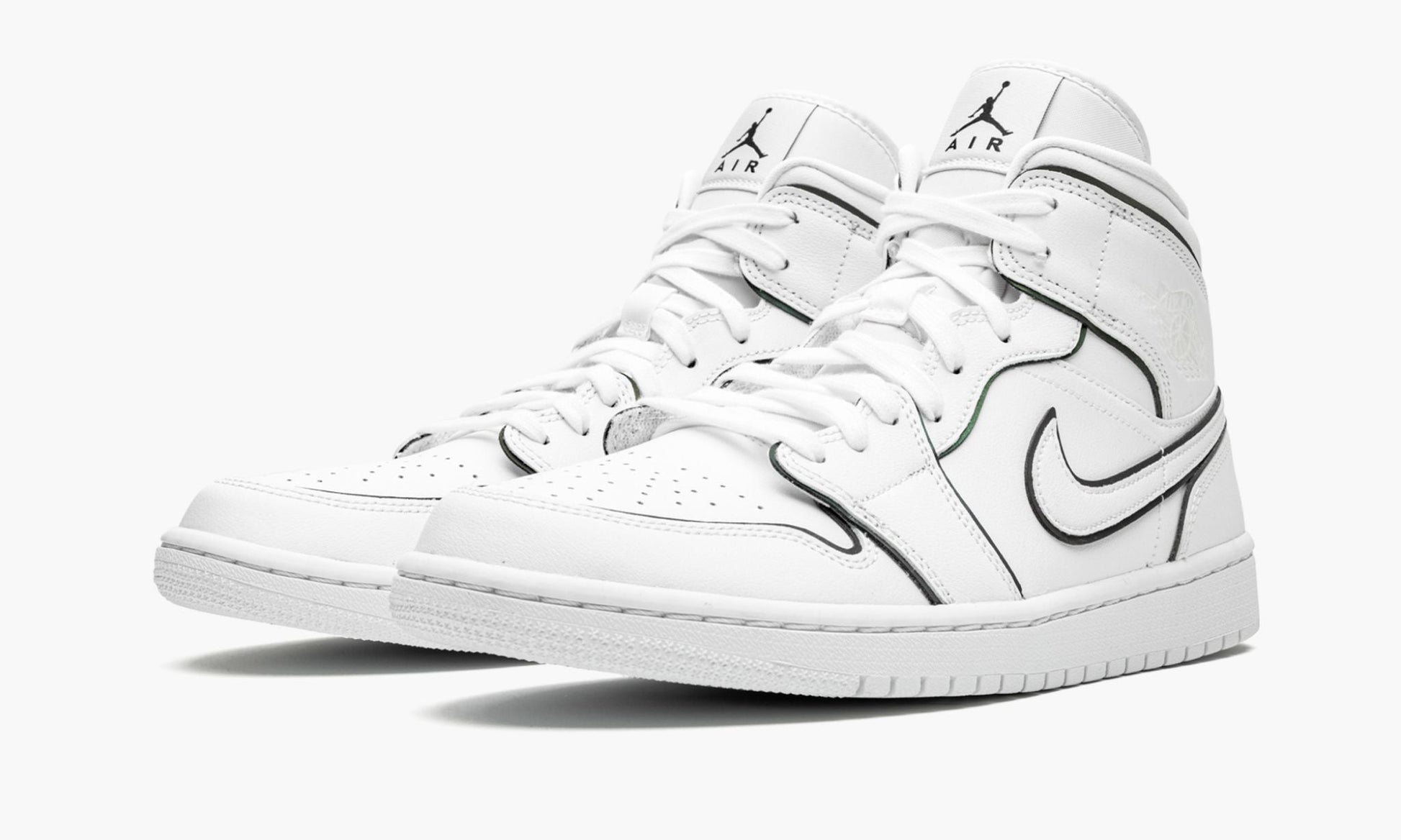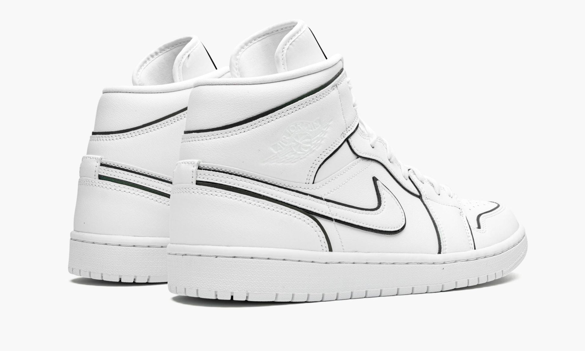 The Women’s Air Jordan 1 Mid “Iridescent Outline” is a women’s-exclusive edition of the mid-top Jordan 1 with a unique "outlined" construction. The upper is composed of a white leather base and features detailing in the form of a perforated toe, embossed tonal Wings logo on the collar and Swoosh on the mid-panel. Iridescent trimming is seen around each panel in a reflective material that changes color when hit with light. The rest of the women's-exclusive Air Jordan 1 Mid, including the tongue, midsole, and outsole, is finished off in crisp white.