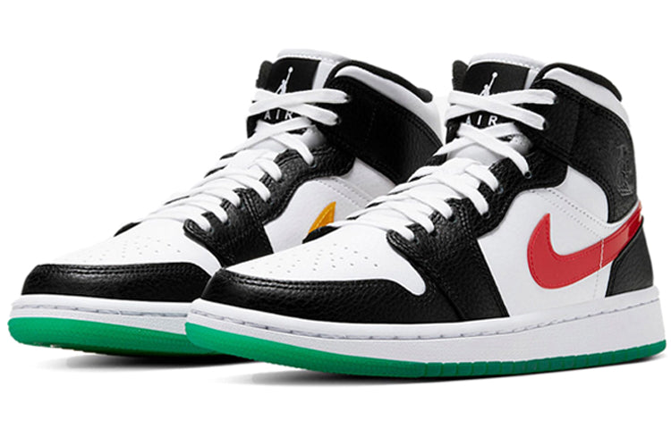 Dressed in a Black, University Red, White, and Lucid Green color scheme. This mid-top Air Jordan 1 features a White leather upper with Black tumbled overlays detailed with Red and Yellow Swooshes on the sides. A White midsole atop a translucent green outsole completes the design.