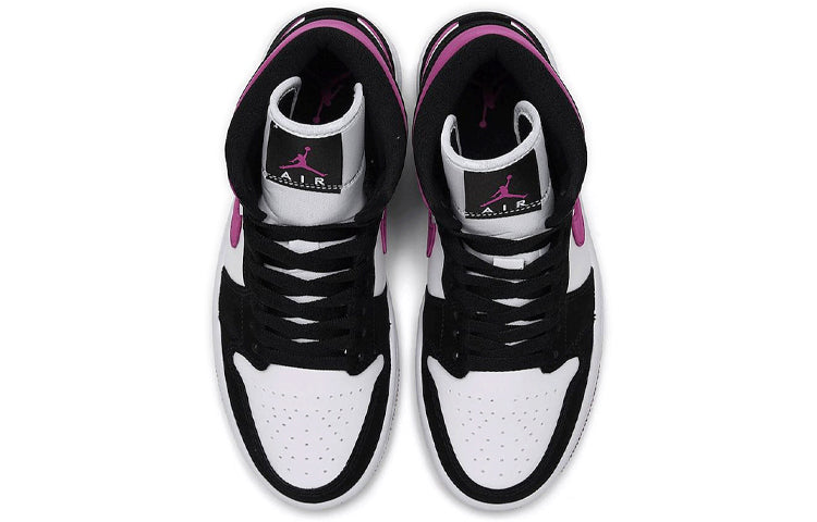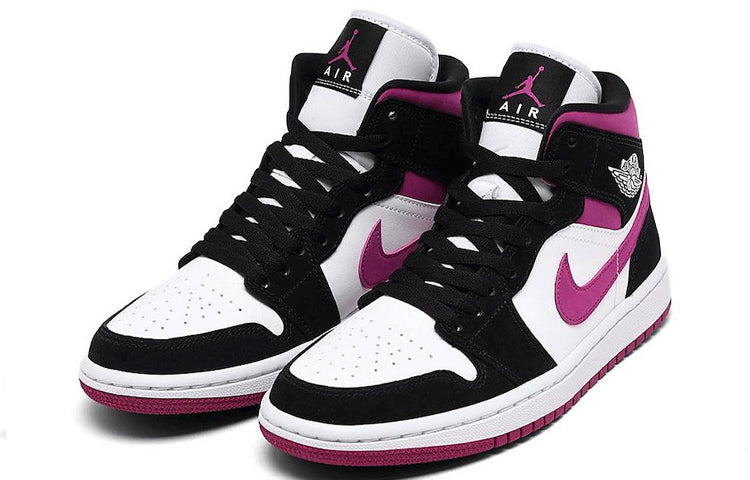 Nike W Air Jordan 1 Mid Magenta features a white leather base with black nubuck overlays. Highlighting the shoe are Magenta accents throughout as well as covering its rubber outsole.
