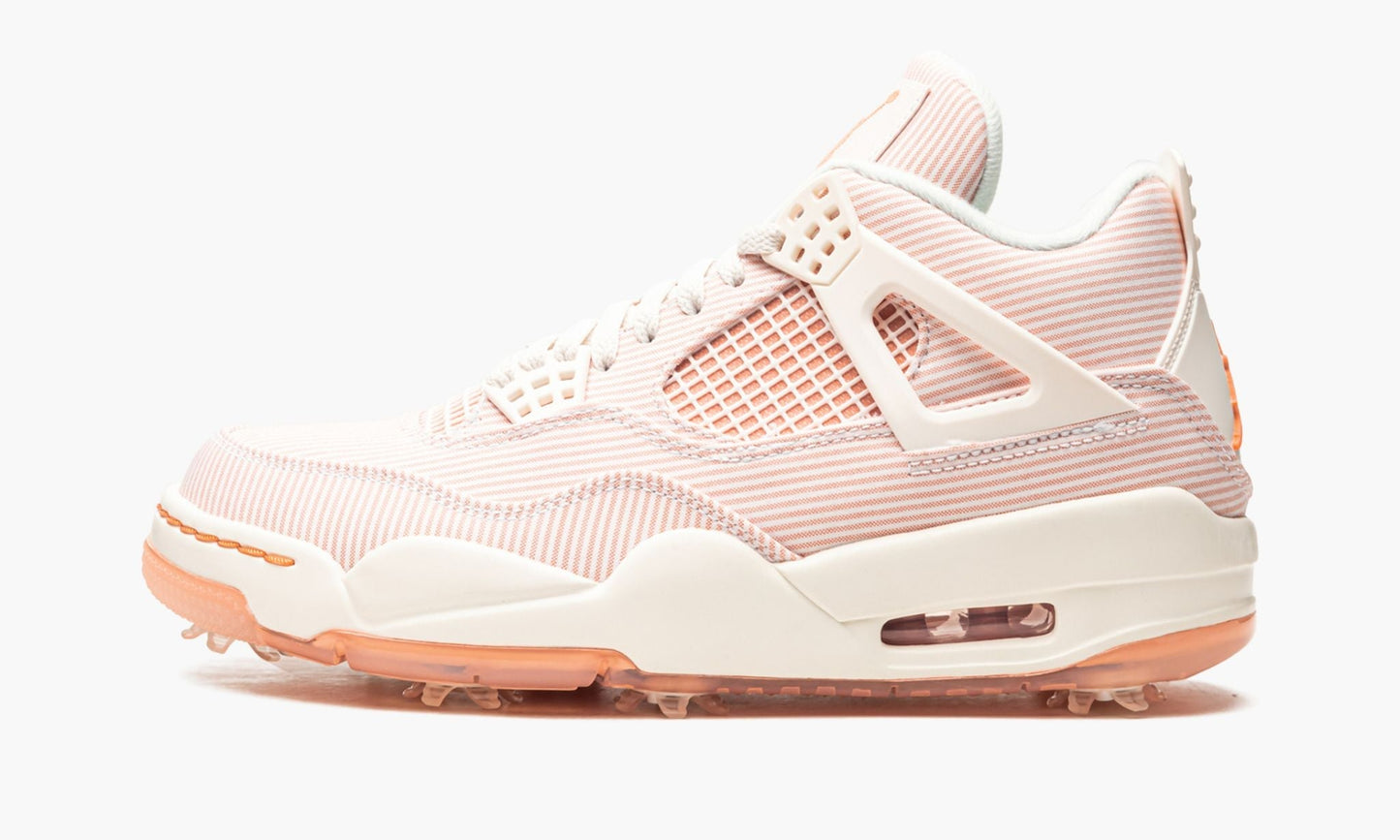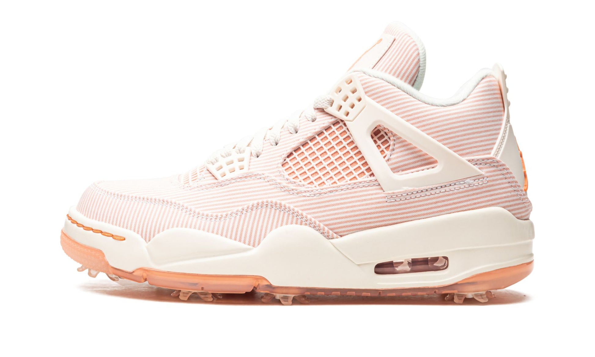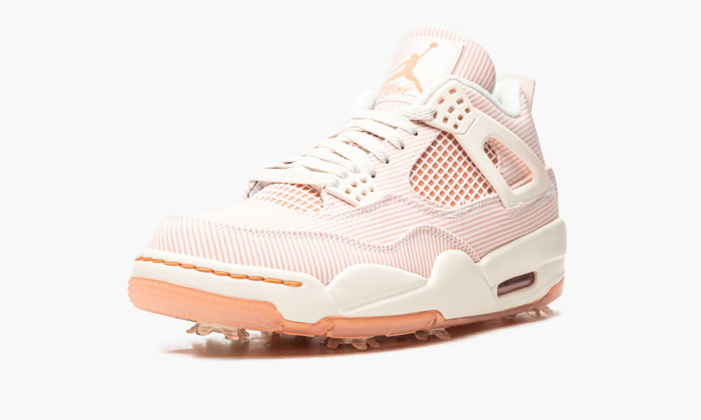 The Air Jordan 4 Golf “Seersucker” is a golf shoe by Jordan Brand that is based on Michael Jordan’s legendary fourth signature basketball shoe. Released just prior to the 2021 PGA Championship in May 2021, the Jordan 4 Golf “Seersucker” appears in a summer-ready, striped, light orange design. Lightweight seersucker material covers the entire upper, save for the white netting on both the mid-panel and tongue, both of which are original design components of the first Air Jordan 4 by Nike. Sail “wings” lace holders can be found on either side. A pinku002Flight orange Jumpman logo graces the nylon tongue tag and the heel. The small visible Air bubble in the heel of the cream-colored midsole is a true-to-original look for the retro basketball shoe. Jordan Brand adds rubber spikes to the semi-translucent outsole. Release date: May 21, 2021
