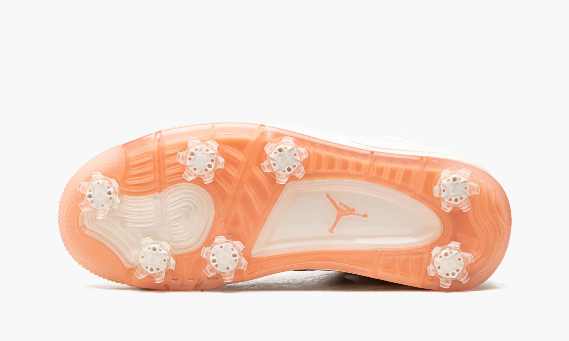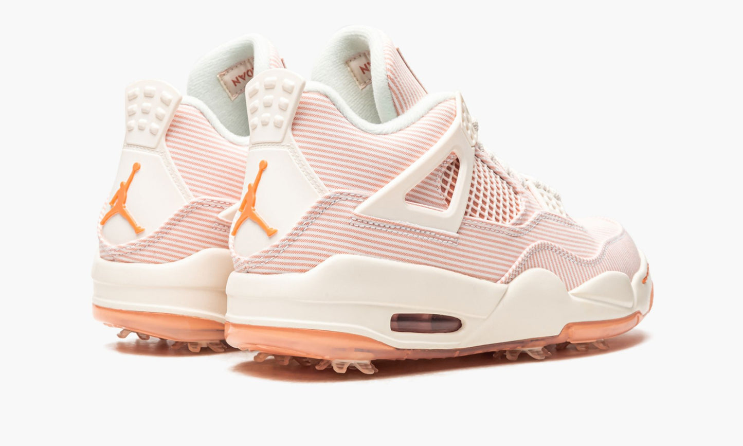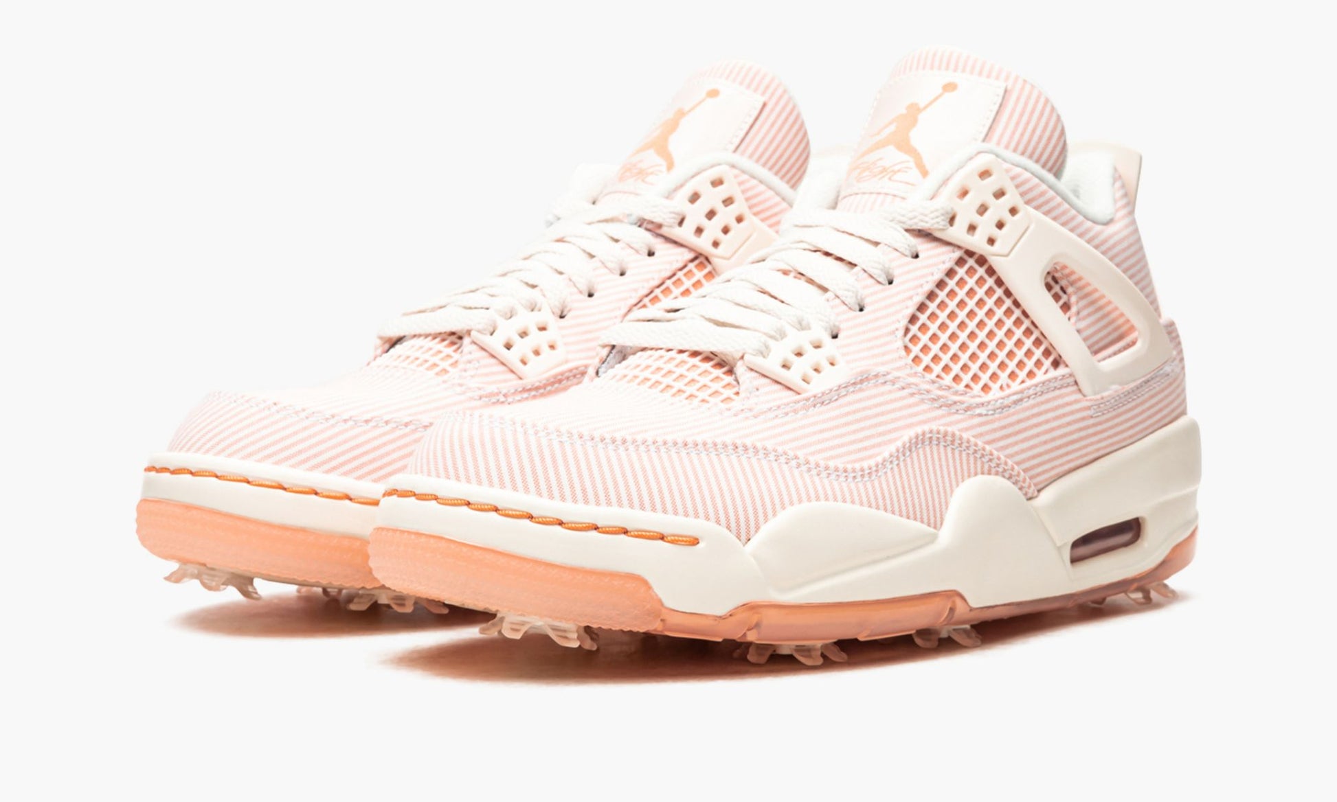 The Air Jordan 4 Golf “Seersucker” is a golf shoe by Jordan Brand that is based on Michael Jordan’s legendary fourth signature basketball shoe. Released just prior to the 2021 PGA Championship in May 2021, the Jordan 4 Golf “Seersucker” appears in a summer-ready, striped, light orange design. Lightweight seersucker material covers the entire upper, save for the white netting on both the mid-panel and tongue, both of which are original design components of the first Air Jordan 4 by Nike. Sail “wings” lace holders can be found on either side. A pinku002Flight orange Jumpman logo graces the nylon tongue tag and the heel. The small visible Air bubble in the heel of the cream-colored midsole is a true-to-original look for the retro basketball shoe. Jordan Brand adds rubber spikes to the semi-translucent outsole. Release date: May 21, 2021