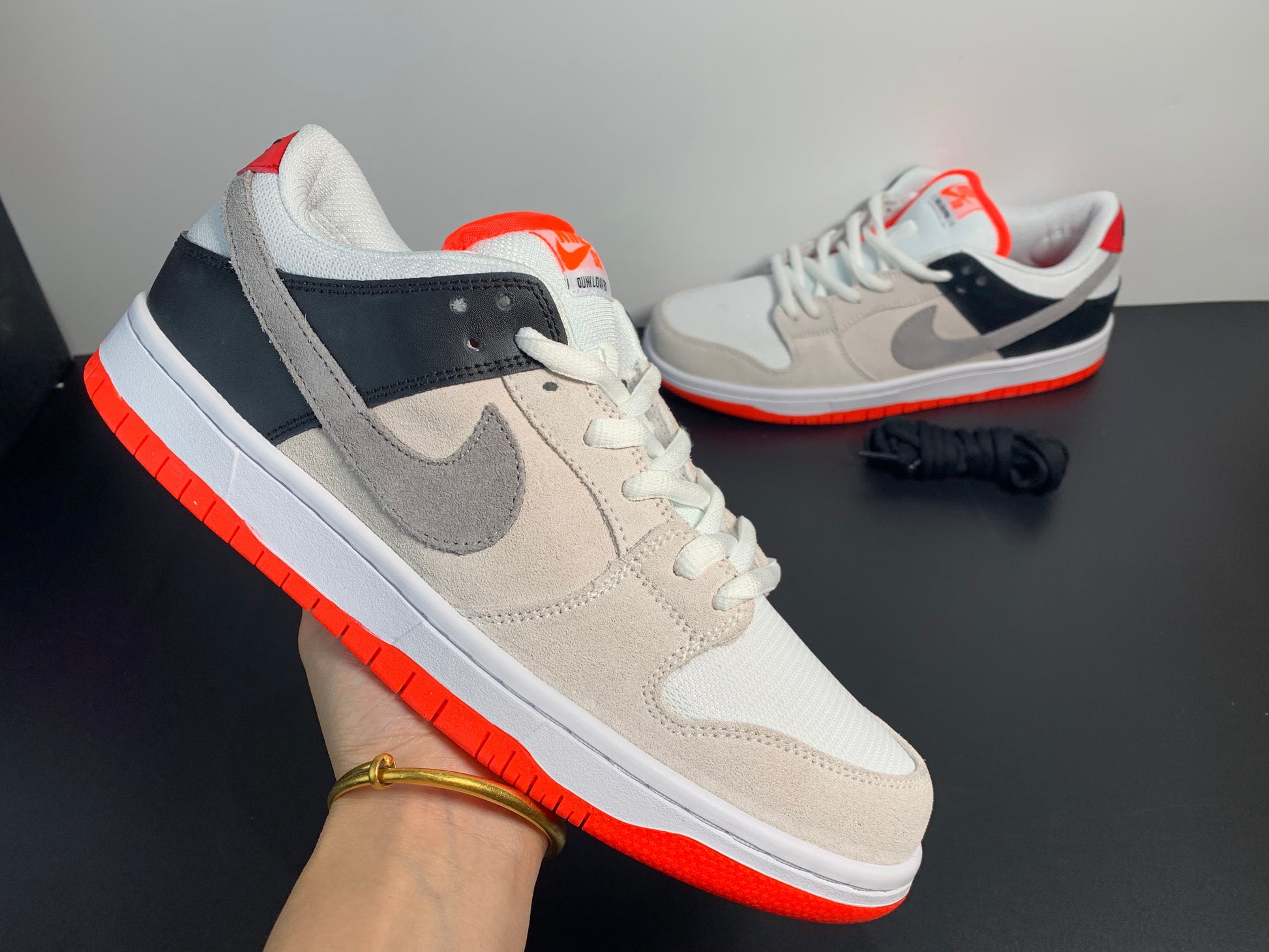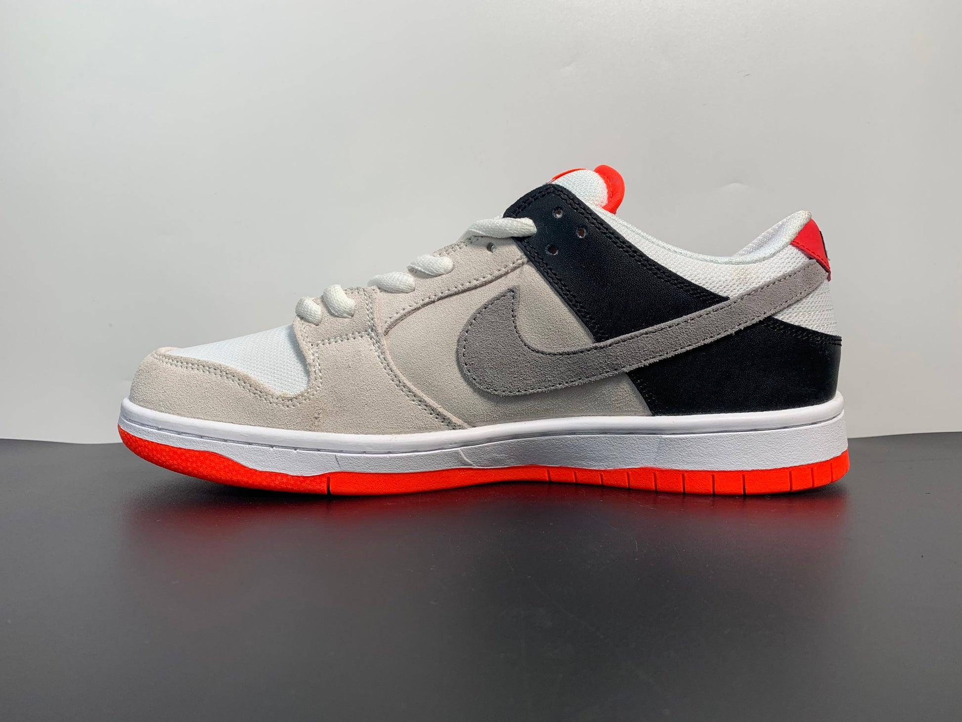 The Dunk Low SB 'AM90 Infrared' celebrates the 30th anniversary of the Air Max 90 by borrowing the retro runner’s iconic OG color scheme. The low-top features a predominantly grey suede upper with black leather on the heel overlay and breathable white mesh at the toe box and collar. Contrasting pops of Infrared appear at the tongue, heel tab and rubber outsole.