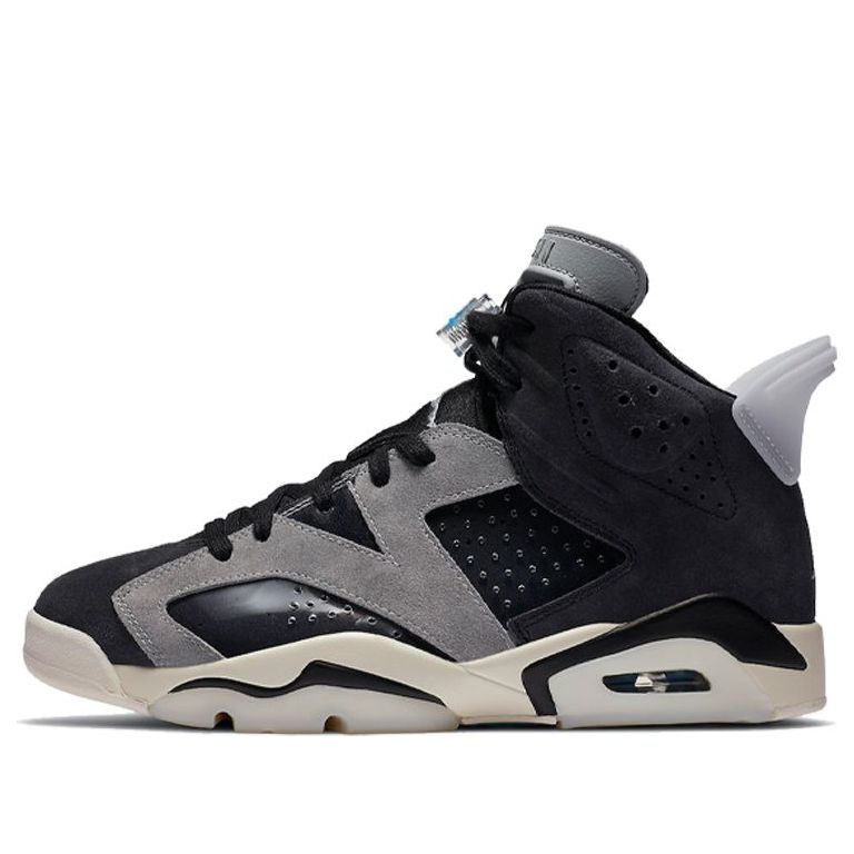 This Jordan 6 has a more energetic look than the previous release, featuring a white-and-gray and chromy color scheme. Special details includes abstract black graphics on midsole, Semi-translucent shiny black on the side and Suede black on the toe and collar.